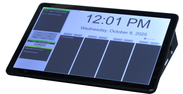 Chorister Slant 10" carillon is built on an industrial touch screen system assembled on an angled aluminum cabinet, perfect for locations with limited space.