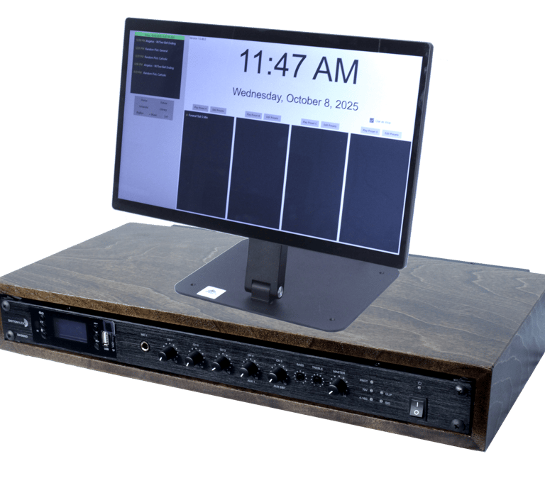 Our Chorister Ultra, a premium, state-of-the-art electronic carillon, replicates the timeless sound of traditional cast bells, digitally sampled at a donor- and budget-friendly price. Touch the screen with your finger or click the mouse. Radio remote control included. A built-in drop-down Liturgical Calendar is included. Program interruption/vacation for the time when you want the programming of the bells to be silent for hours, days, or during Holy Week. Our carillon has an instant drop-down calendar future view for adjusting program schedules in advance of an upcoming holiday or event.